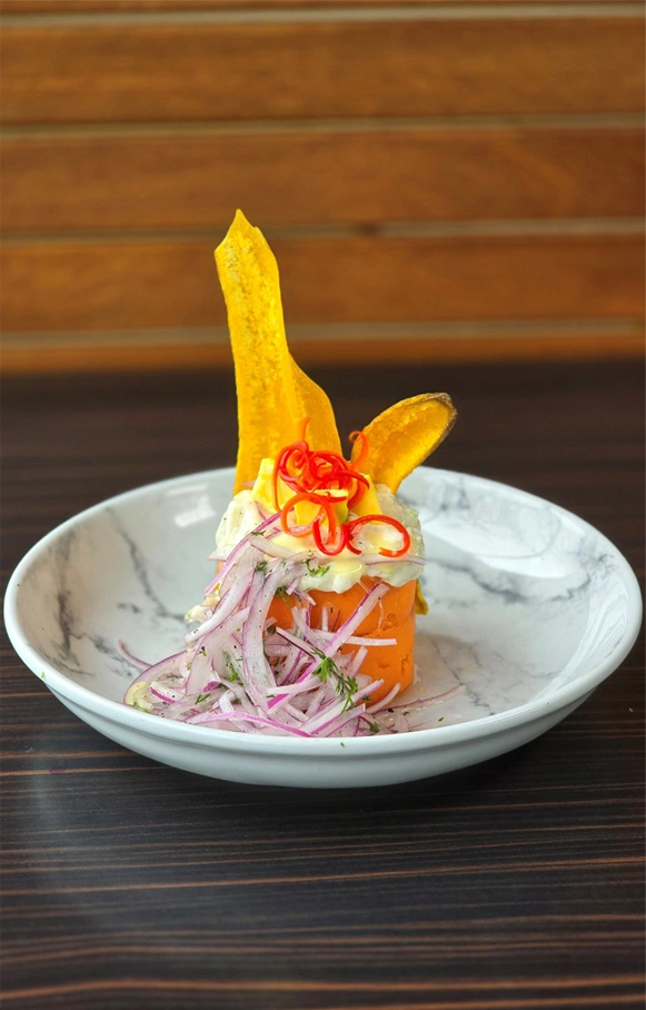 Segundo piso, el olor a ají amarillo y pisco (aguardiente típico del Perú) son inconfundibles, ceviche, causa, tiradito lomo saltado, ají de gallina, tacu tacu a lo macho, camarones esturión, chaufa esturión.