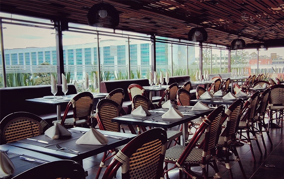 "Cuatro pisos diseñados para brindarte experiencias únicas. En el primer nivel, comienza tu aventura gastronómica con sabores inolvidables. En el segundo, te recibimos con una cálida bienvenida en nuestra recepción, junto a la cocina donde ocurre la magia. El tercer piso te espera con una exclusiva zona VIP para momentos especiales, y en el cuarto nivel, nuestro espectacular rooftop te ofrece el escenario perfecto para celebrar el evento de tu vida."